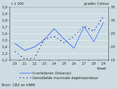 In de eerste drie weken van juli 2006 zijn 500 mensen meer overleden dan gemiddeld. Het grootste deel van deze extra sterfgevallen vond plaats in de week van 17 tot en met 23 juli (week 29). Toen overleden bijna 2,8 duizend mensen, 300 meer dan gemiddeld in deze week. Deze hogere sterfte hangt samen met de hoge temperatuur in deze week. De gemiddelde maximale dagtemperatuur in week 29 bedroeg volgens het KNMI 31,5 graden Celsius.