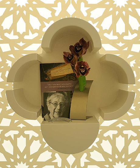 Stilteruimte Herdenkenissen geeft bewoners van woonzorgcentrum Peppelrode een bijzondere plek om stil te staan bij verlies. Een opengewerkte lichtwand met een geometrisch bloemenpatroon herbergt negen nissen. In deze herdenkenissen kunnen bewoners hun dierbaren herdenken op een persoonlijke manier. Met bloemen, een kaars, foto’s. De vormgeving van de ruimte laat zich niet vangen door de stigma’s die herdenkingsruimtes met zich mee brengen. Integendeel: Herdenkenissen is lichtvoetig en ongedwongen. De ruimte is aangenaam, het licht fris en zacht. Planten zorgen voor een serene sfeer en een aangename geur. Een bijbehorend, speciaal ontworpen herdenkenissenboek biedt ruimte voor een blijvende herinnering aan alle bewoners.