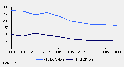 Het aandeel autobestuurders onder de verkeersdoden is bij 18- tot 25-jarigen hoger dan bij 25-plussers. Bovendien volgt de sterfte onder de jonge bestuurder vaak op een botsing tegen een boom, vangrail of paal. Het aantal jonge verkeersdoden is de afgelopen tien jaar wel met de helft afgenomen.