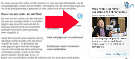Bij de artikelen over rouw staan aan de rechterkant (zie afbeelding hieronder) van de pagina filmpjes geplaatst waarin prof.dr. Manu Keirse ingaat op het beschreven onderwerp op de betreffende pagina.
