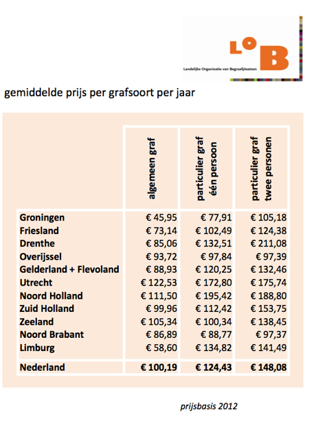 De kosten van een graf in Nederland zijn gemiddeld circa € 10,- per maand. Dat is de uitkomst van een uitgebreid onderzoek dat de Landelijke Organisatie van Begraafplaatsen (LOB) in 2012 hield. In het onderzoek zijn met uitzondering van de kosten voor een eventueel monument alle éénmalige en jaarlijkse kosten meegenomen. Per provincie verschillen de kosten. Zo liggen Groningen (- 28%), Noord-Brabant (- 26%) en Overijssel (- 23%) lager en zijn Noord-Holland (+ 27%), Utrecht (+ 23%) en Drenthe (+ 19%) hoger dan het landelijk gemiddelde.