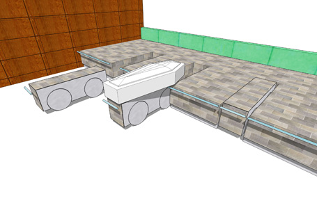 De baar waarop de kist met de overledene vervoerd werd is aan de achter- en bovenzijde bekleed met natuursteen. Pas als de baar het eindpunt bereikt is duidelijk dat dit materiaal overeenkomt met het natuursteen waar de baar tussen gereden wordt. Van een bewegend element is de baar plotseling onderdeel van een statische natuursteen sokkel geworden. De processie door het crematorium is tot een einde gekomen en de nabestaanden nemen hier afscheid.